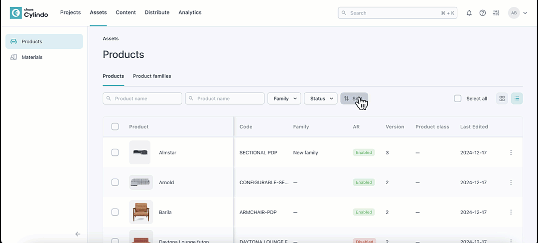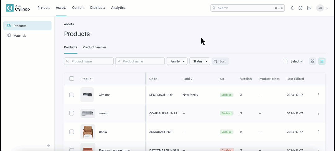 List view — Key product details like name, code, family, AR (enabled/disabled), version, Product class, and last edited date are displayed.