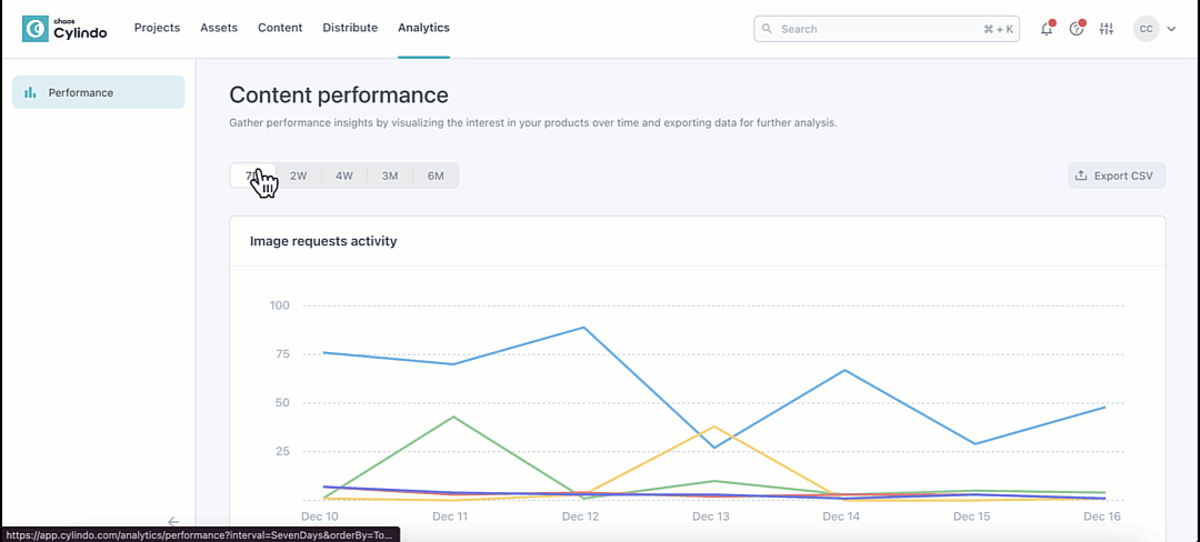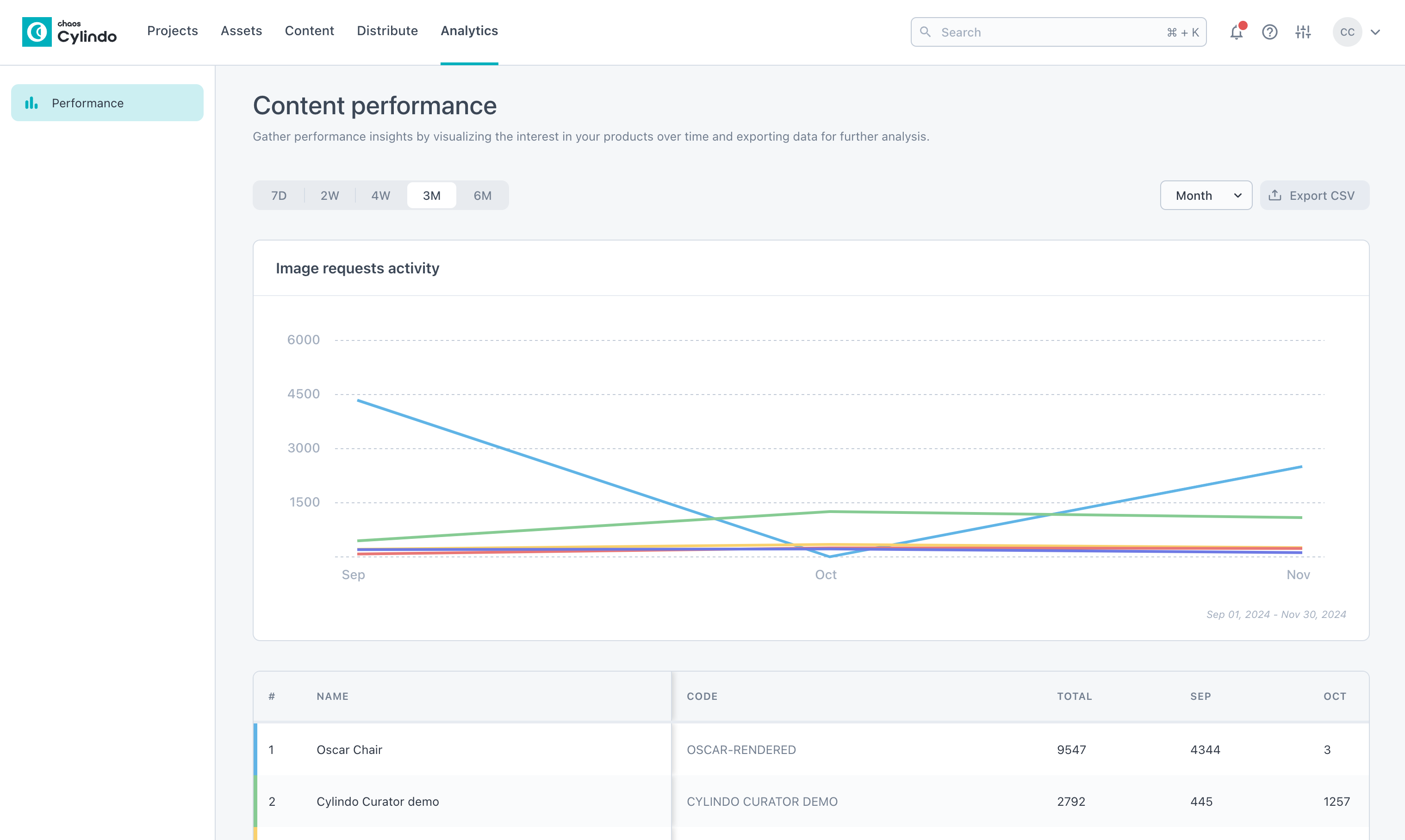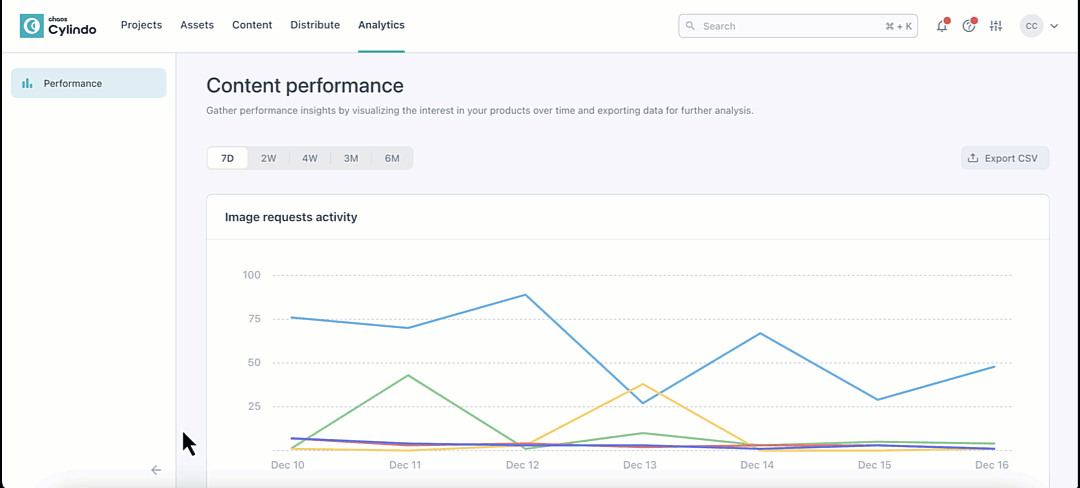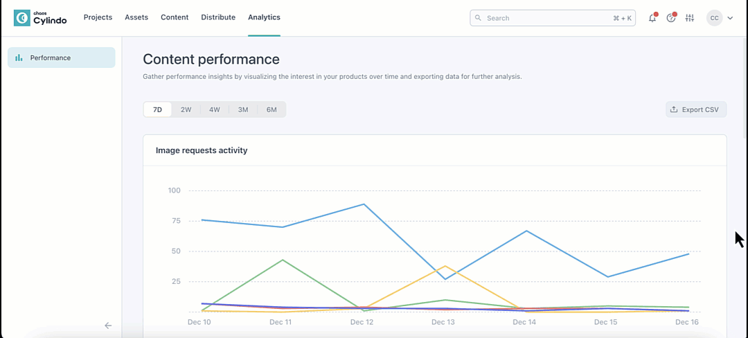 The new Analytics page provides a dedicated place to access detailed insights into how your Cylindo content—like 360 HD and Studio Lifestyle images—is performing. By tracking metrics such as image views, user interactions, and product configurations, this feature helps you measure the impact and effectiveness of your visual content.